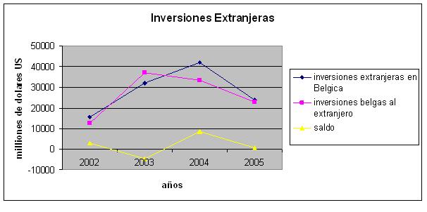 INVERSIONES EXTRANJERAS Para los datos recogidos, entre 2002 y 2005, podemos ver que excepto en 2003, hubo más inversiones en el territorio belga que inversiones belgas al extranjero sobre todo en 2004. El Gobierno belga se esfuerza a atraer los inversores extranjeros bajando los impuestos, por ejemplo, para las empresas extranjeras y así dinamizar su propia actividad económica con las inversiones extranjeras y el papel que estas mismas juegan en un crecimiento económico. TIPO DE CAMBIO |