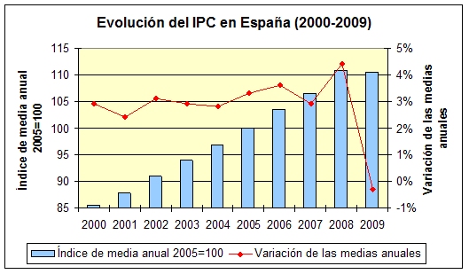 La tasa interanual del Índice de Precios al Consumo se sitúa en niveles negativos en el año 2009 (tasa que no se encontraba desde 1978). Esta bajada se explica por la bajada de los precios de los bienes y servicios, es decir, los cambios acaecidos en el mercado.
